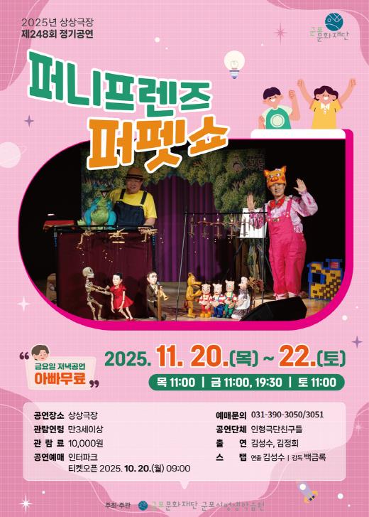 [뉴스앤톡] 군포문화재단 군포시평생학습원 상상극장은 오는 11월 20일부터 22일까지 정기공연으로 인형극 ‘퍼니프렌즈 퍼펫쇼’를 무대에 올린다.