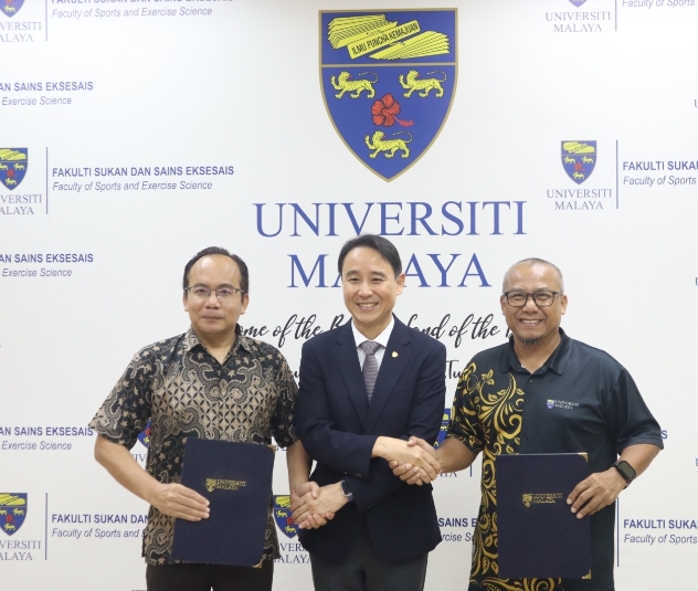 | ▲ 말라야대학교 스포츠학부의 줄카르나인 자파르 학장, 경상국립대학교 체육진흥원 이승은 원장, 말라야대학교 스포츠센터 아피잘 아부 오스만 원장 |