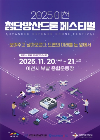 이천시는 오는 11월 20일부터 21일까지 이틀간, 부발읍 종합운동장(무촌리 52) 일원에서 ‘2025 이천 첨단방산드론 페스티벌’을 개최한다. 개막식은 11월 20일 14:00로 드론의 미래를 보는 첫걸음을 내딛을 예정이다.