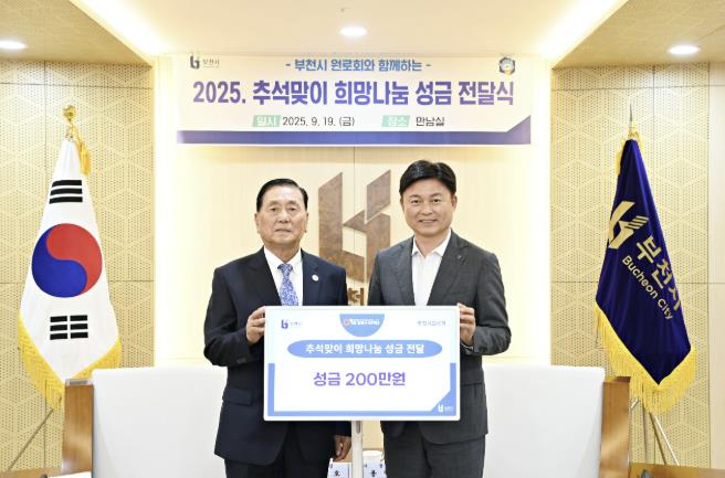 [뉴스앤톡] 부천시는 지난 19일 부천시청 만남실에서 부천시 원로회가 추석을 앞두고 희망나눔 성금 200만 원을 전달했다고 밝혔다. 전달식에는 조용익 부천시장이 참석해 지역사회 나눔에 앞장서는 원로회에 감사의 뜻을 표했다.