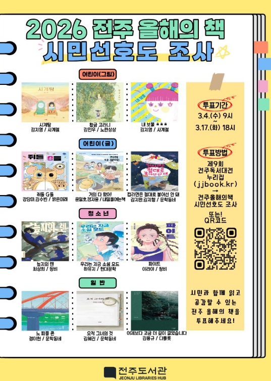 시, 오는 3월 17일까지 ‘2026 전주 올해의 책’ 선정을 위한 온라인 시민 선호도 조사 실시