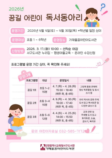 [뉴스앤톡] 인천광역시교육청서구도서관은 오는 17일부터 어린이 독서동아리 ‘꿈길’에 참여할 관내 초등학생을 모집한다.