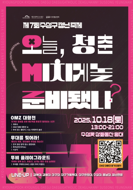 [뉴스앤톡] 대구 수성구는 오는 18일 수성못 상화동산 일대에서 ‘2025 제7회 수성구 청년축제’를 개최한다.