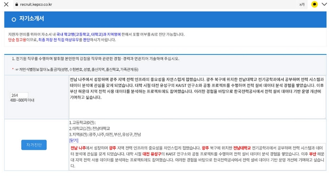 [뉴스앤톡] 한국전력이 채용 지원자의 편의를 높이고 공정한 채용 환경을 조성하기 위해, 자기소개서 AI 자가 진단과 네이버 인증 기반 자격증 자동 반영 서비스를 채용 시스템에 전격 도입한다.