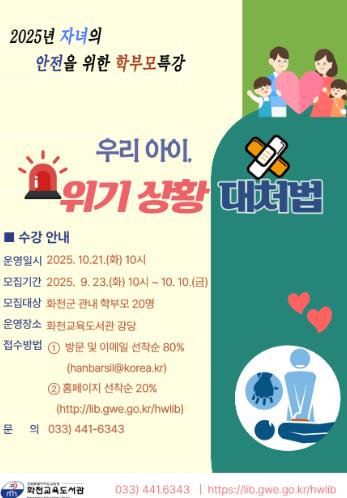 [뉴스앤톡] 화천교육도서관은 10월 21일 10시, 화천군 관내 학부모를 대상으로 학부모 소통(疏通) 프로그램 ‘우리 아이, 위기 상황 대처’ 특강을 운영한다.