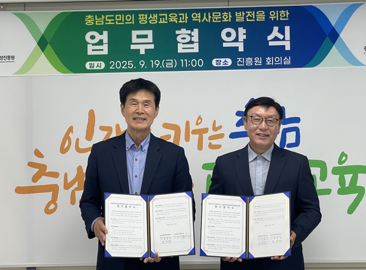 장기승 연구원장은 “연구원의 연구성과가 진흥원의 교육 콘텐츠로 연계되어 적극 활용되길 기대한다”고 밝히고, 황환택 진흥원장은 “역사문화 교육은 평생 학습의 기반이며, 도민의 일상속에서 충남의 가치를 체감하는 배움의 기회를 확대하겠다”고 강조했다.