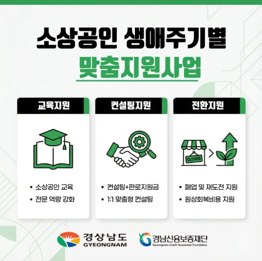 [뉴스앤톡] 경상남도는 경기침체와 소비 위축 등 어려운 경영 환경 속에서 도내 소상공인의 경쟁력 강화를 위해 ‘소상공인 생애주기별 맞춤 지원사업’을 추진한다고 밝혔다.