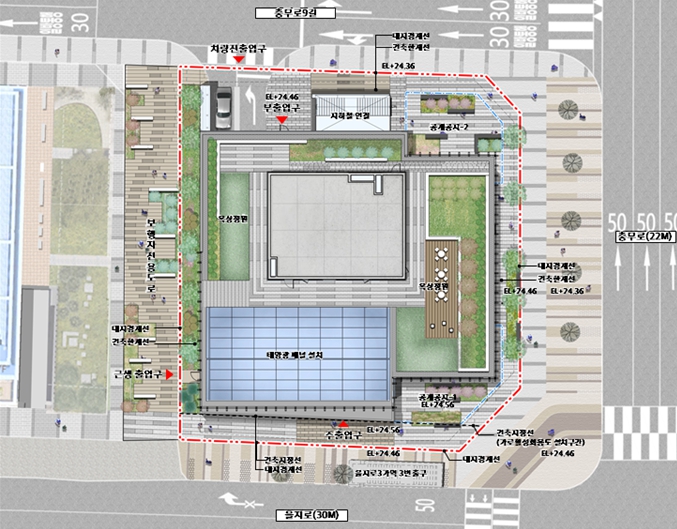 대상지 동측에 공개공지를 배치하여 충무로변을 따라 청계천으로 이어지는 쾌적한 보행공간을 확보했고, 보행자전용도로를 보행친화적으로 조성하여 서측 사업지(을지로3가 12지구)의 공개공지와 더불어 쾌적한 보행환경이 확보될 것으로 기대하고 있다.