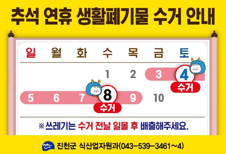 이와 함께 군은 연휴 기간 발생할 수 있는 불편에 대비해 3일부터 9일까지 ‘생활쓰레기 상황반(043-539-3461~4)’을 운영한다.