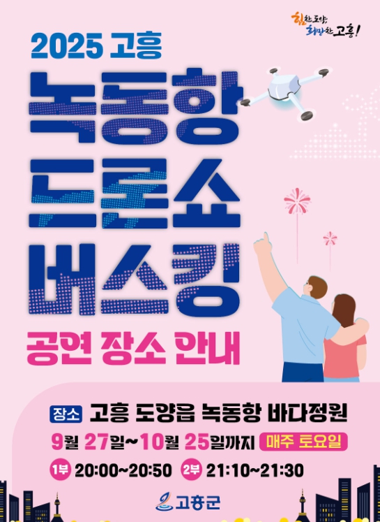 [뉴스앤톡] 고흥군은 우주항공드론 및 지붕 없는 미술관 고흥을 방문하는 관광객과 군민을 위해 매주 토요일 저녁 8시, 녹동항 바다정원 일대에서 '2025 고흥 녹동항 드론쇼 버스킹'을 진행하고 있다고 밝혔다.