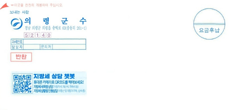 [뉴스앤톡] 의령군은 지방세 고지서 전면에 ‘지방세 챗봇 상담서비스’ QR코드를 삽입해 발송한다고 밝혔다.