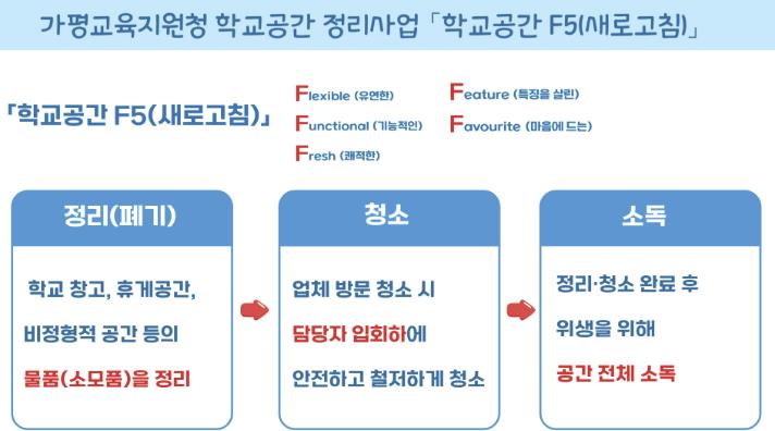 ‘학교공간 정리사업 F5(새로고침)’의 F5는 새로고침이라는 뜻도 있지만, Flexible(유연한), Functional(기능적인), Fresh(쾌적한), Feature(특색 있는), Favourite(선호하는)이라는 의미를 담고 있다.