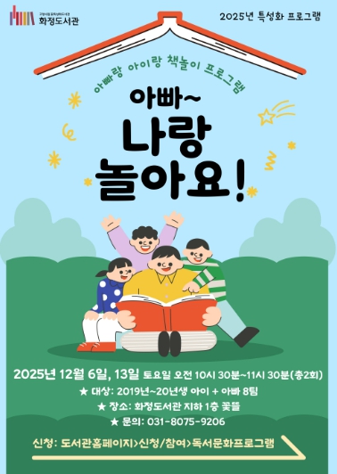 [뉴스앤톡] 고양특례시 화정도서관은 오는 12월 6일, 13일 오전 10시 30분, 화정도서관 지하 1층 꽃뜰에서 특성화 프로그램 ‘아빠~ 나랑 놀아요!'를 운영한다.