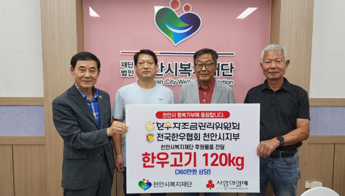 [뉴스앤톡] (재)천안시복지재단은 22일 한우자조금관리위원회와 전국한우협회 천안시지부가 360만 원 상당의 한우 국거리 120kg를 기탁했다고 밝혔다.