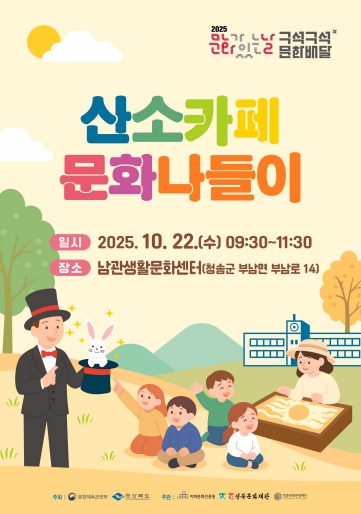[뉴스앤톡] (재)청송문화관광재단은 오는 10월 22일과 11월 25일 청송군 부남면 남관생활문화센터에서 2025 문화가 있는 날 '구석구석 문화배달' 사업의 일환으로 ‘산소카페 문화나들이’ 행사를 개최한다.
