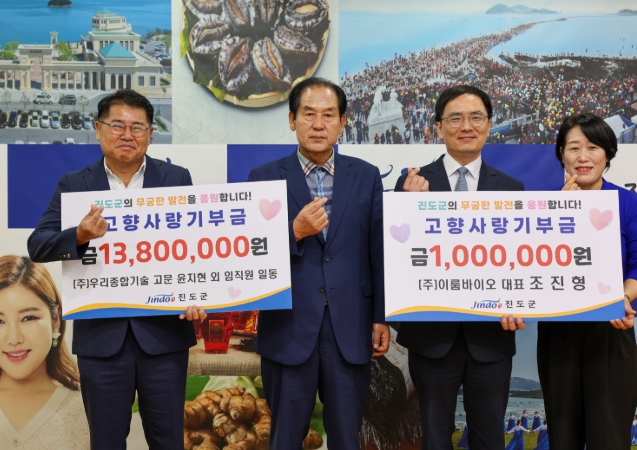 [뉴스앤톡] 진도군은 지난 8월 22일에 ㈜우리종합기술 윤지현 고문 등 임직원이 1,380만 원, ㈜이룸바이오 조진형 대표가 100만 원을 고향사랑기부금으로 기탁 했다고 밝혔다.