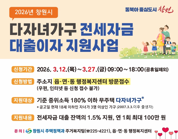 [뉴스앤톡] 창원특례시는 세자녀 이상 다자녀가구의 전세자금 대출에 대한 이자 부담을 줄이고 안정적인 주거환경을 조성하기 위해 “창원시 다자녀가구 전세자금 대출이자 지원사업”을 시행한다고 밝혔다.