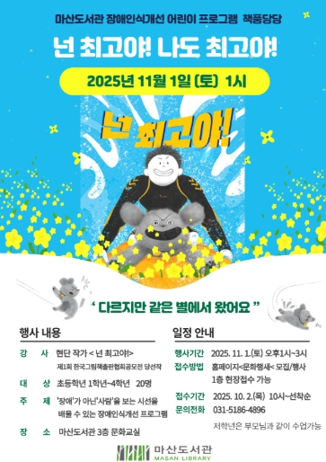 [뉴스앤톡] 김포시 마산도서관은 오는 11월 1일 오후 1시부터 3시까지, 장애인식개선 어린이 프로그램 책풍당당 '넌 최고야! 나도 최고야!'을 운영한다.