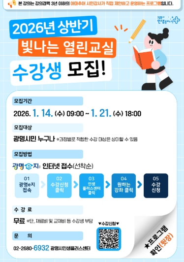 [뉴스앤톡] 광명시 인생플러스센터는 오는 14일부터 21일까지 시민이 기획하고 운영하는 ‘2026년 상반기 빛나는 열린교실’의 수강생 230명을 모집한다.