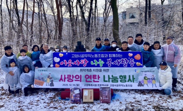 [뉴스앤톡] 고양특례시는 지난 14일, 직장동아리‘한울봉사회’와‘고양시공무직노동조합’와 함께 지역 취약계층을 위한 겨울맞이 생필품·연탄 나눔 봉사활동을 실시했다고 밝혔다.