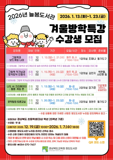 [뉴스앤톡] 경상북도교육청 청도도서관(관장 조은희)은 겨울방학을 맞아 어린이들의 창의력과 사고력을 키울 수 있는 '2026년 늘봄도서관 겨울방학특강' 수강생을 오는 12월 19일부터 모집한다.