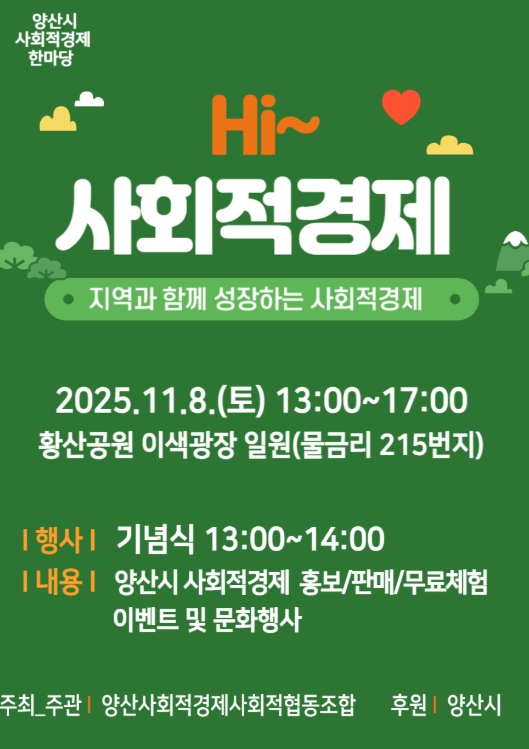 [뉴스앤톡] 양산시는 오는 8일 오후 1시부터 오후 5시까지 황산공원 이색광장 일원에서 2025년 사회적경제 한마당(부제‘Hi~ 사회적경제’) 행사를 개최한다.
