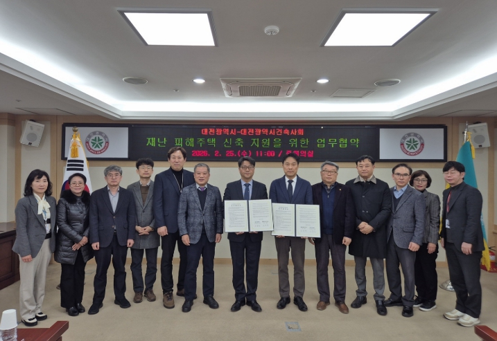 [뉴스앤톡] 대전시는 25일 시청 중회의실에서 대전광역시건축사회와 ‘재난 피해주택 신축 지원을 위한 업무협약’을 체결했다.