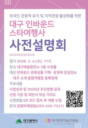 [뉴스앤톡] 대구광역시와 대구문화예술진흥원 관광본부는 오는 3월 4일 오전 11시 대구예술발전소 수창홀에서 대구 소재 종합여행업 등록업체를 대상으로 ‘2026년 대구 인바운드 스타여행사 육성사업’ 사전 설명회를 개최한다.