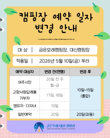 [뉴스앤톡] 여주도시공사는 오는 5월 10일부터 이용자 중심의 고품질 서비스 제공을 위해 금은모래캠핑장, 대신캠핑장의 온라인 통합예약 일정을 대폭 간소화한다고 밝혔다.