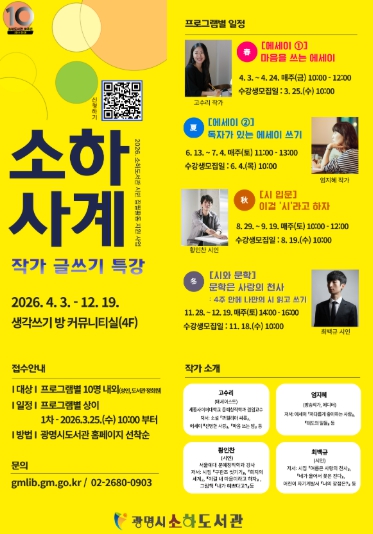 [뉴스앤톡] 광명시 소하도서관이 오는 25일부터 전문 작가와 함께하는 글쓰기 강좌 ‘소하사계’ 봄 특강 참여자를 모집한다.
