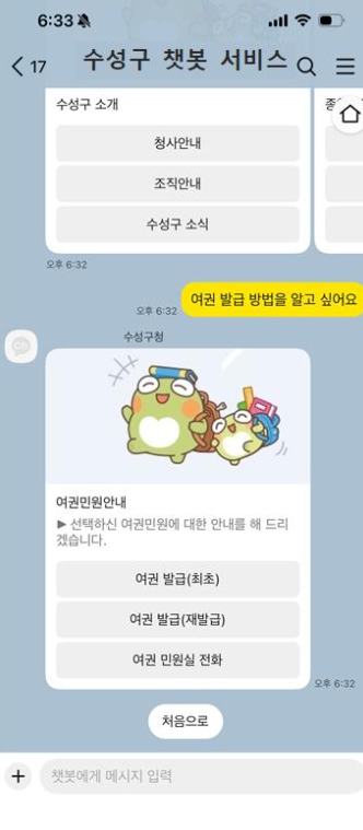 수성구는 이번 챗봇 도입으로 단순 반복 민원 응대 효율을 높이고, 고령층 등 디지털 취약계층도 몇 번의 터치만으로 다양한 행정 정보에 쉽고 빠르게 접근할 수 있을 것으로 기대하고 있다.