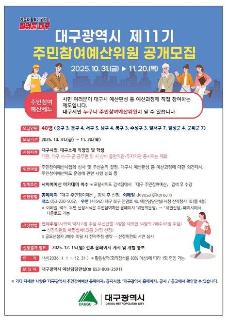 [뉴스앤톡] 대구광역시는 2026년 주민참여예산제 운영에 참여할 제11기 주민참여예산위원 40명을 공개 모집한다.