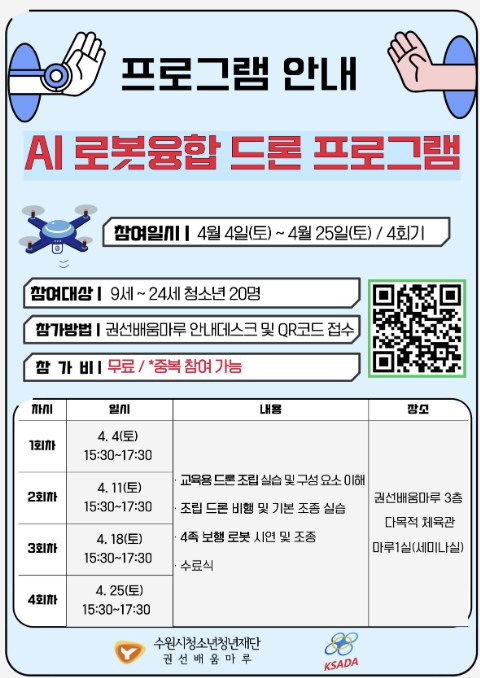 [뉴스앤톡] 수원시청소년청년재단 권선배움마루는 오는 4월 청소년을 대상으로 AI 로봇융합 드론 프로그램을 운영할 계획이다. 이번 프로그램은 이론과 실습을 병행한 교육으로 구성되어 미래기술에 대한 이해를 높이고 디지털 역량을 강화하는 데 목적이 있다.