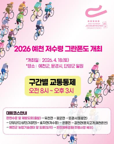 [뉴스앤톡] 예천군은 오는 18일 오전 8시부터 오후 3시까지 예천군과 문경시, 단양군 일원에서 '2026 예천 저수령 그란폰도' 대회를 개최한다고 밝혔다.