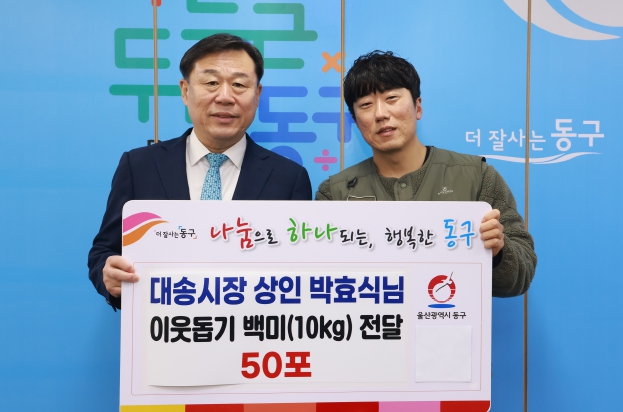 [뉴스앤톡] 울산 동구 대송시장에서 식품유통업체를 운영하고 있는 new캐슬장터 박효식 대표가 1월 28일 오전 11시 10분 동구청을 방문해 시가 200만원 상당의 쌀(10kg) 50포를 전달했다.