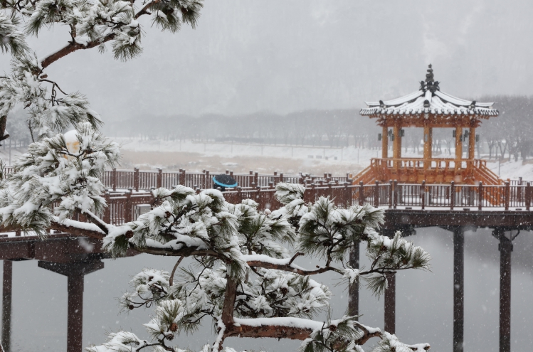 ▲ 24일 충북 괴산군 에코브릿지에 눈이 내려앉아 겨울 설경을 연출하고 있다.