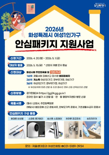 지원 대상은 화성시에 주민등록을 둔 범죄피해자 및 여성 1인가구, 한부모가정 등 여성가구이며, 범죄피해자와 저소득층을 우선 선정한다. 다만 2023년부터 2025년까지 안심패키지 지원을 받은 기 수혜자는 이번 사업 대상에서 제외된다.