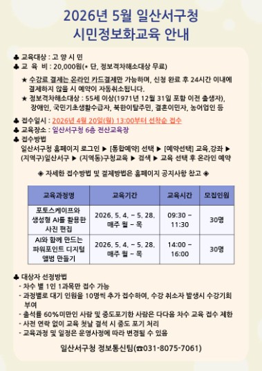 교육은 5월 4일부터 5월 28일까지 매주 월요일부터 목요일까지 진행되며, 과정별 30명을 모집한다. 교육 장소는 일산서구청 6층 전산교육장이다.