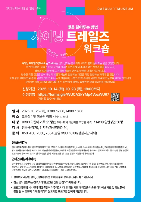 [뉴스앤톡] 대구문화예술진흥원 대구미술관은 오는 10월 25일, 오전 10시, 오후 2시, 총 2회에 걸쳐 열린 교육 ‘샤이닝 트레일즈 워크숍: 빛을 걸어 두는 방법’을 운영한다.