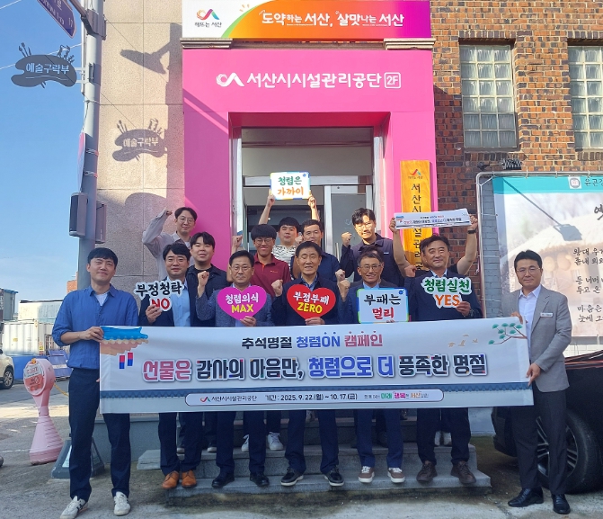 [뉴스앤톡] 서산시시설관리공단은 다가오는 추석 명절을 맞아 건전하고 투명한 조직문화를 확립하기 위해‘청렴ON 캠페인’을 9월 22일부터 10월 17일까지 운영한다고 밝혔다.