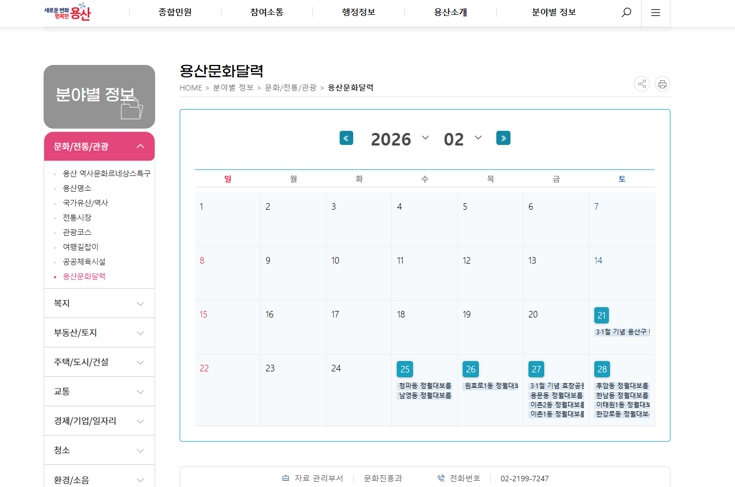 ‘용산문화달력’은 용산구 전역에서 열리는 공연, 전시, 체험 프로그램 등 각종 문화행사 정보를 달력 형태로 통합 제공하는 서비스다. 주민들은 시기별·분야별로 행사 정보를 보다 쉽고 편리하게 확인할 수 있다.