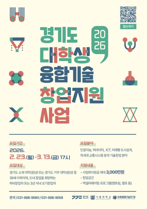 [뉴스앤톡] 경기도와 차세대융합기술연구원은 ‘2026년 경기도 대학(원)생 융합기술 창업지원’ 사업 참가자를 다음 달 13일까지 모집한다.