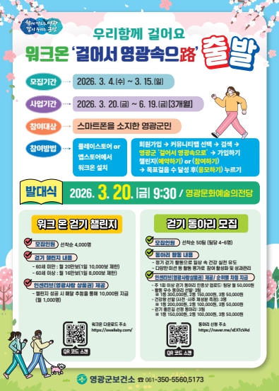 이번 사업은 스마트폰을 소지한 초등학생 이상 영광군민이면 누구나 워크온 커뮤니티 가입을 통해 참여 가능하며, 개인 참여는 물론 4~6명으로 구성된 걷기 동아리(총 50팀 예정)도 함께 모집한다.