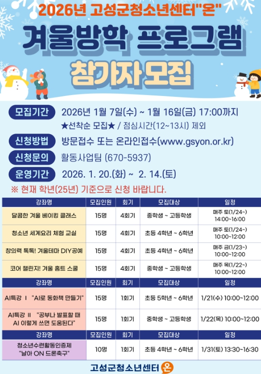 [뉴스앤톡] 고성군청소년센터“온”은 겨울방학을 맞이한 관내 청소년들을 대상으로 2026년 1월 20일부터 2월 14일까지 2026년 겨울방학 프로그램 및 특강을 운영한다.