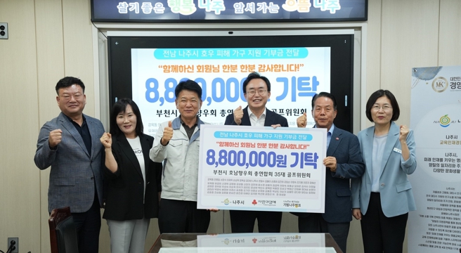 [뉴스앤톡] 전라남도 나주시는 경기도 부천시 호남향우회 총연합회 35대 골프위원회(위원장 안병일, 왼쪽 세 번째)가 집중호우 피해로 어려움을 겪고 있는 수재민 지원 성금 880만 원을 기탁했다고 밝혔다.
