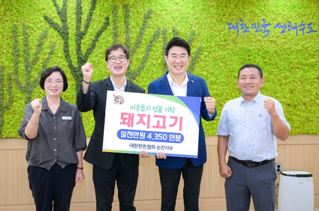 [뉴스앤톡] 순천시는 25일 순천시청에서 (사)대한한돈협회 순천지부(지부장 김선일)와 일천만원 상당의 돼지고기 435박스(870kg) 전달식을 가졌다고 밝혔다.