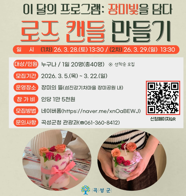 [뉴스앤톡] 전남 곡성군은 ‘장밋빛을 담다’를 주제로 한 로즈캔들 만들기 체험 프로그램을 오는 3월 28일부터 29일까지 이틀간 운영한다고 밝혔다.