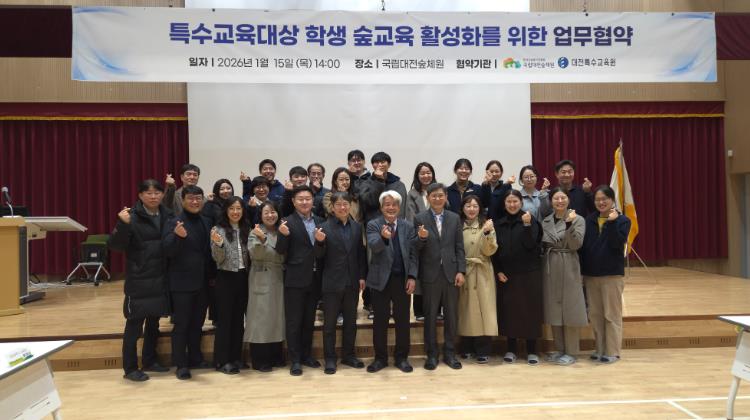 [뉴스앤톡] 대전특수교육원은 1월 15일 국립대전숲체원 강당에서 국립대전숲체원과 ‘특수교육대상학생 숲 교육 활성화’를 위한 업무협약을 체결했다고 밝혔다.