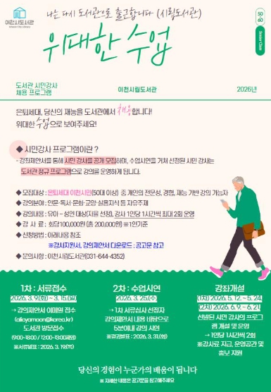 이 가운데 시립도서관의 시민 강사 채용 프로그램 ‘위대한 수업’이 가장 먼저 시작된다. 50대 이상의 이천시민을 대상으로 강의 제안서를 공개 모집하고, 수업 시연을 거쳐 시민 강사를 선발한다. 선발된 시민 강사는 도서관 강좌를 직접 운영하며, 강사료도 지급된다.
