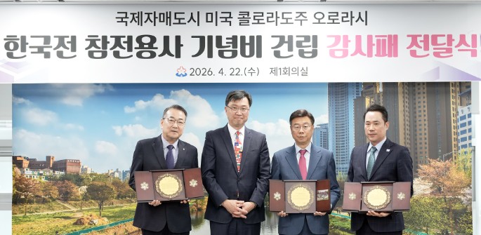 신상진 성남시장은 “대한민국의 자유와 평화를 위해 헌신한 참전용사들의 숭고한 희생을 기리는 기념비가 자매도시 오로라시에 건립되는 뜻깊은 과정에 성남시가 함께할 수 있어 매우 의미 있게 생각한다”며 “이번 감사패는 성남시민을 대표해 받는 것으로, 앞으로도 자유와 평화의 가치를 바탕으로 한미 동맹을 공고히 하고 지속적인 국제 교류를 이어가겠다”고 말했다.